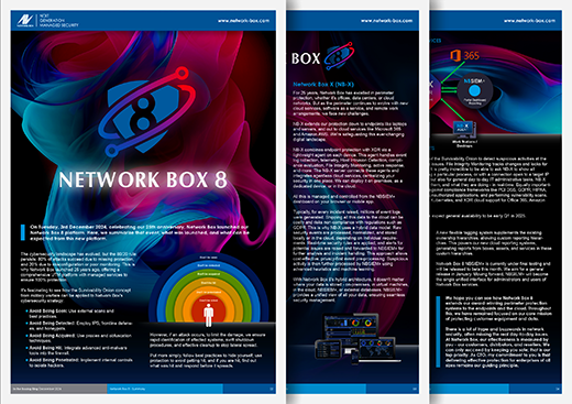 本月,为庆祝公司成立 25 周年,Network Box 推出了 Network Box 8 平台。在过去的二十五年里,Network Box 在周界保护方面表现出色,无论是办公室、数据中心还是云网络,现在我们很高兴推出 Network Box 8。我们在增强顶级技术的同时,还将保护范围向下扩展到端点,向上扩展到云,所有这一切都以隐私为中心。在第 2 至第 4 页,我们将重点介绍其主要功能以及对这一新平台的期待。